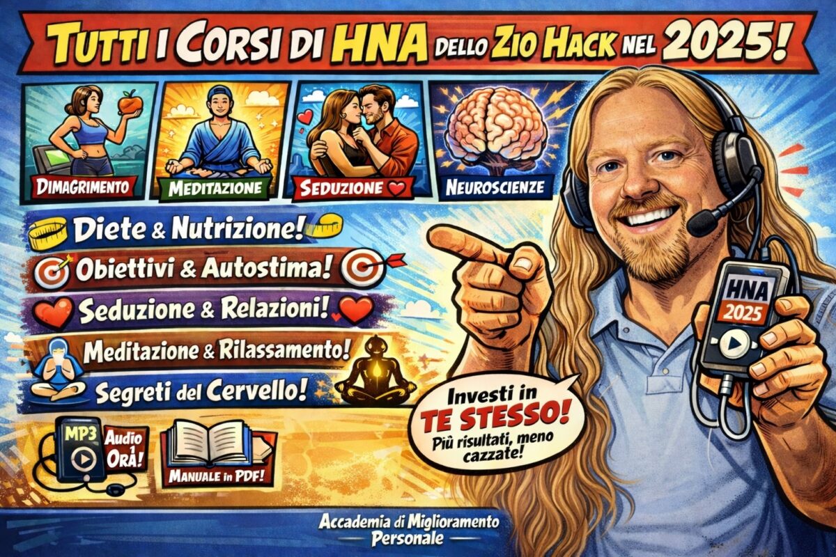 Tempo stimato di lettura: < 1 minEcco l’elenco di Tutti i Corsi di HNA dello zio Hack (con Audio di un’ora, Manuale e Trascrizione) fatti nel 2025 Tutti i Corsi che lo Zio Hack ha rilasciato del 2025: Salute, Abitudini, Meditazione, Rilassamento, Relazioni e altro ancora… Tutte le HNA sono in formato Audio mp3 di oltre 1 ora ascoltabile ovunque e con qualsiasi dispositivo. Tutte […]